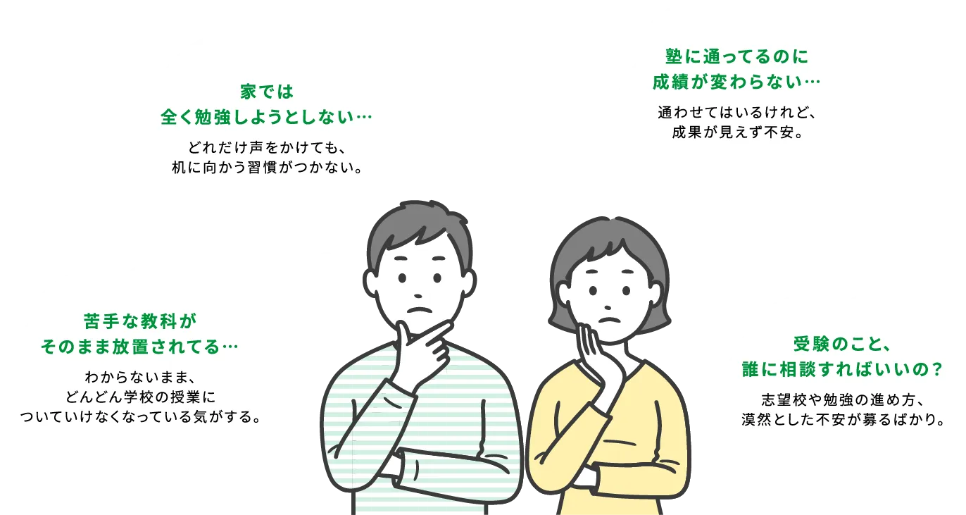 そんなお悩みを抱える保護者の方へ。緑風塾では、お子さま一人ひとりの性格や学力に合わせて、やる気と結果につながる4つのサポートを行っています。